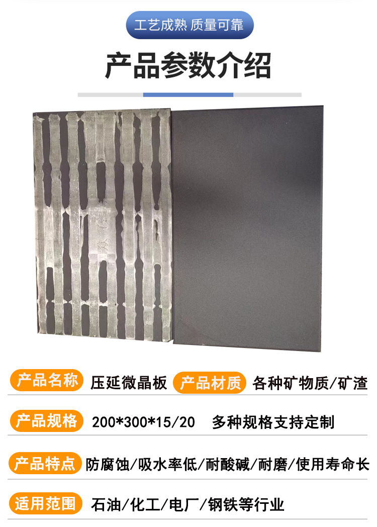 壓延微晶板材的耐磨性比錳鋼高7-8倍,比鑄鐵高15-20倍,耐酸堿性能比不銹鋼和橡膠高15-25倍,可大量替代鑄鐵、鑄石、高分子密度板、耐酸磚、花崗巖、大理石等,應(yīng)用于造紙、煤炭、鋼鐵、電力、化工、有色冶金等行業(yè)的料倉、漏斗、溜槽、刮板機(jī)、表面處理等部位。